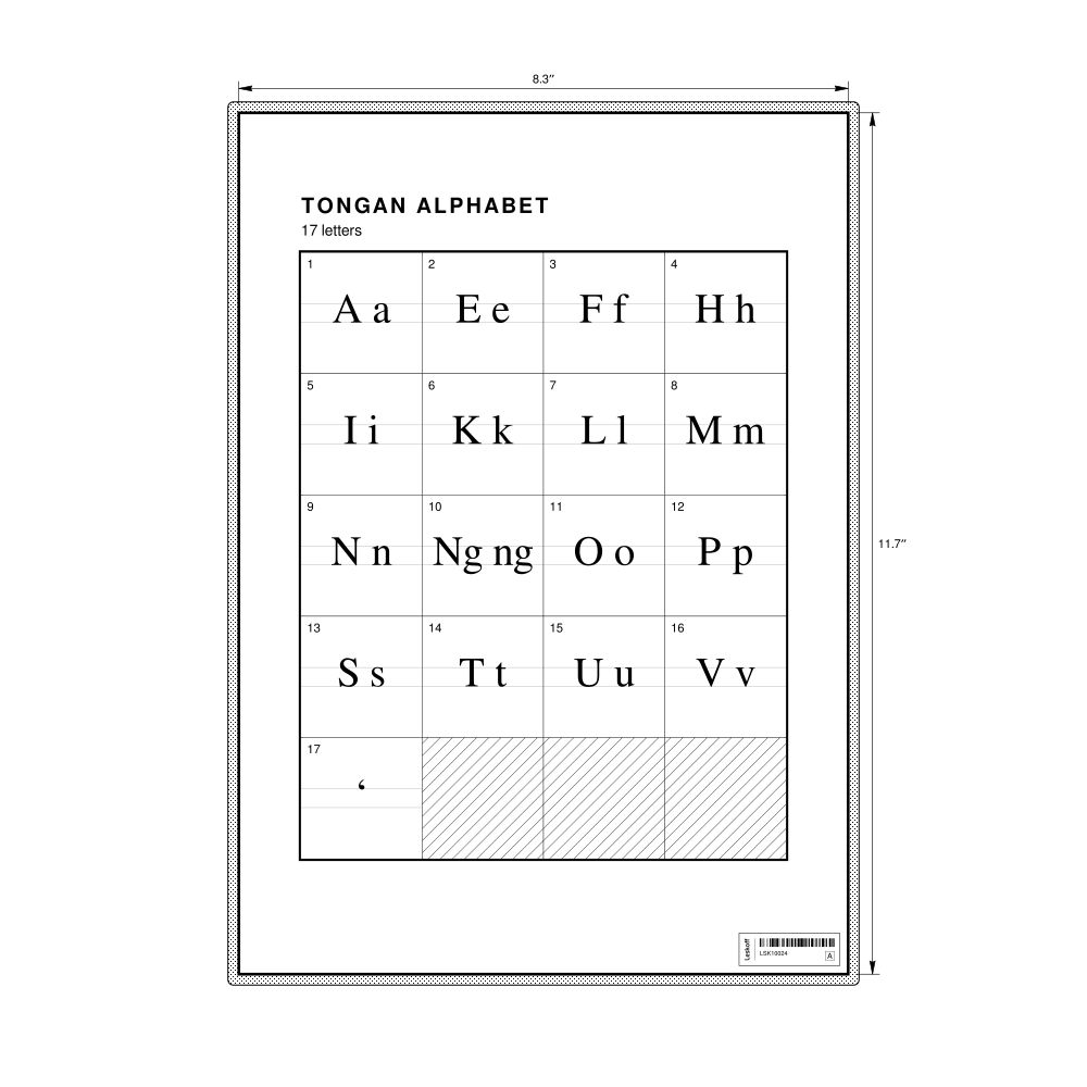 The Tongan alphabet chart (the full set of letters) in the 8.3 x 11.7 in (21.0 x 29.7 cm, desk chart, laminated) format.