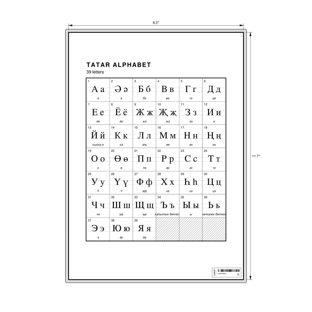 The Tatar alphabet chart (the full set of letters) in the 8.3 x 11.7 in (21.0 x 29.7 cm, desk chart, laminated) format.