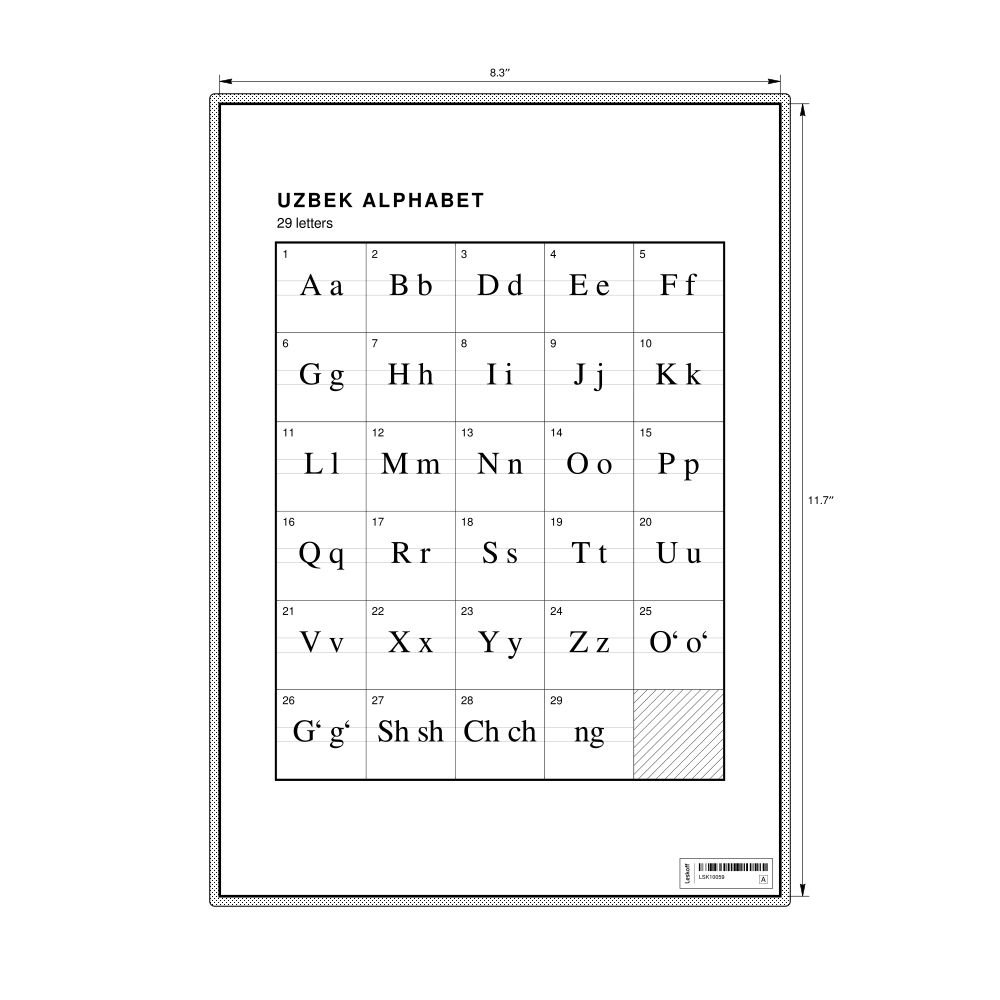 The Uzbek alphabet chart (the full set of letters) in the 8.3 x 11.7 in (21.0 x 29.7 cm, desk chart, laminated) format.