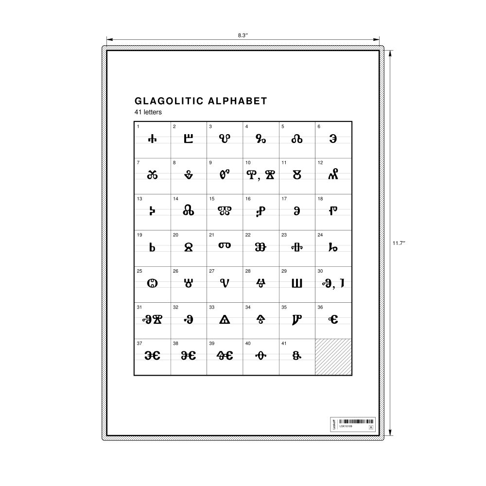 The Glagolitic alphabet chart (the full set of letters) in the 8.3 x 11.7 in (21.0 x 29.7 cm, desk chart, laminated) format.