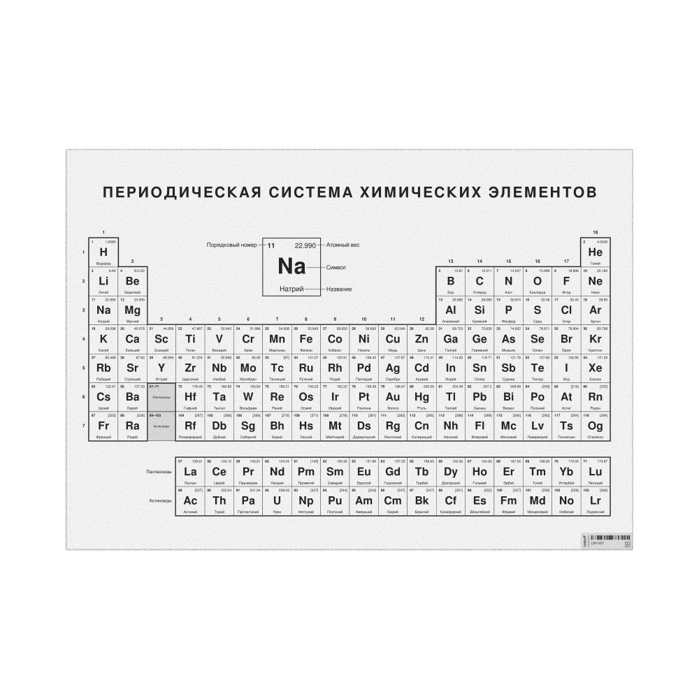 A periodic table chart in Russian (Периодическая система химических элементов) in the 33.1 x 23.4 in (84.1 x 59.4 cm, poster / wall chart) format. 18-column layout featuring the atomic numbers, atomic weights, symbols, and names of all chemical elements.