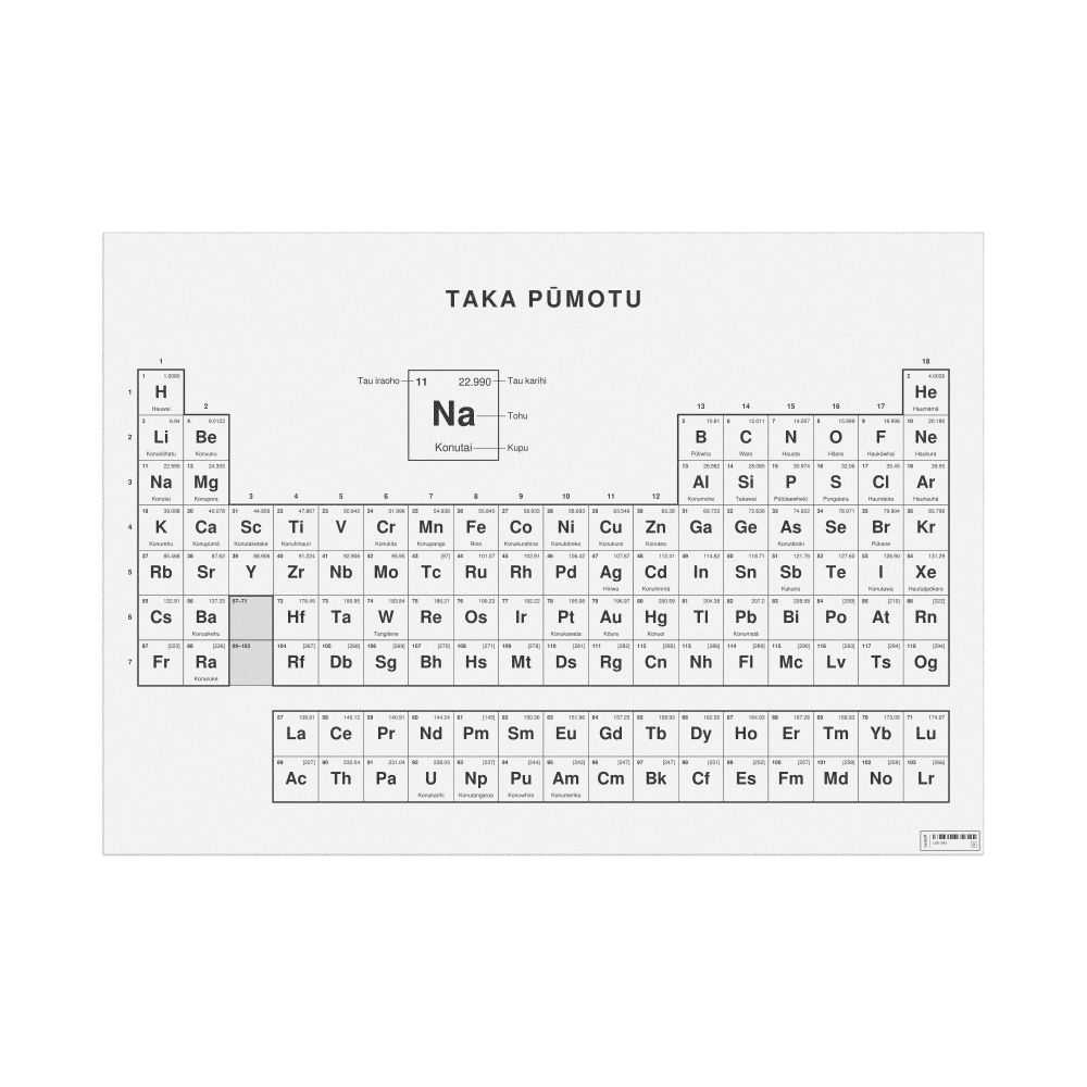 A periodic table chart in Māori (Taka pūmotu) in the 33.1 x 23.4 in (84.1 x 59.4 cm, poster / wall chart) format. 18-column layout featuring the atomic numbers, atomic weights, symbols, and names of all chemical elements.