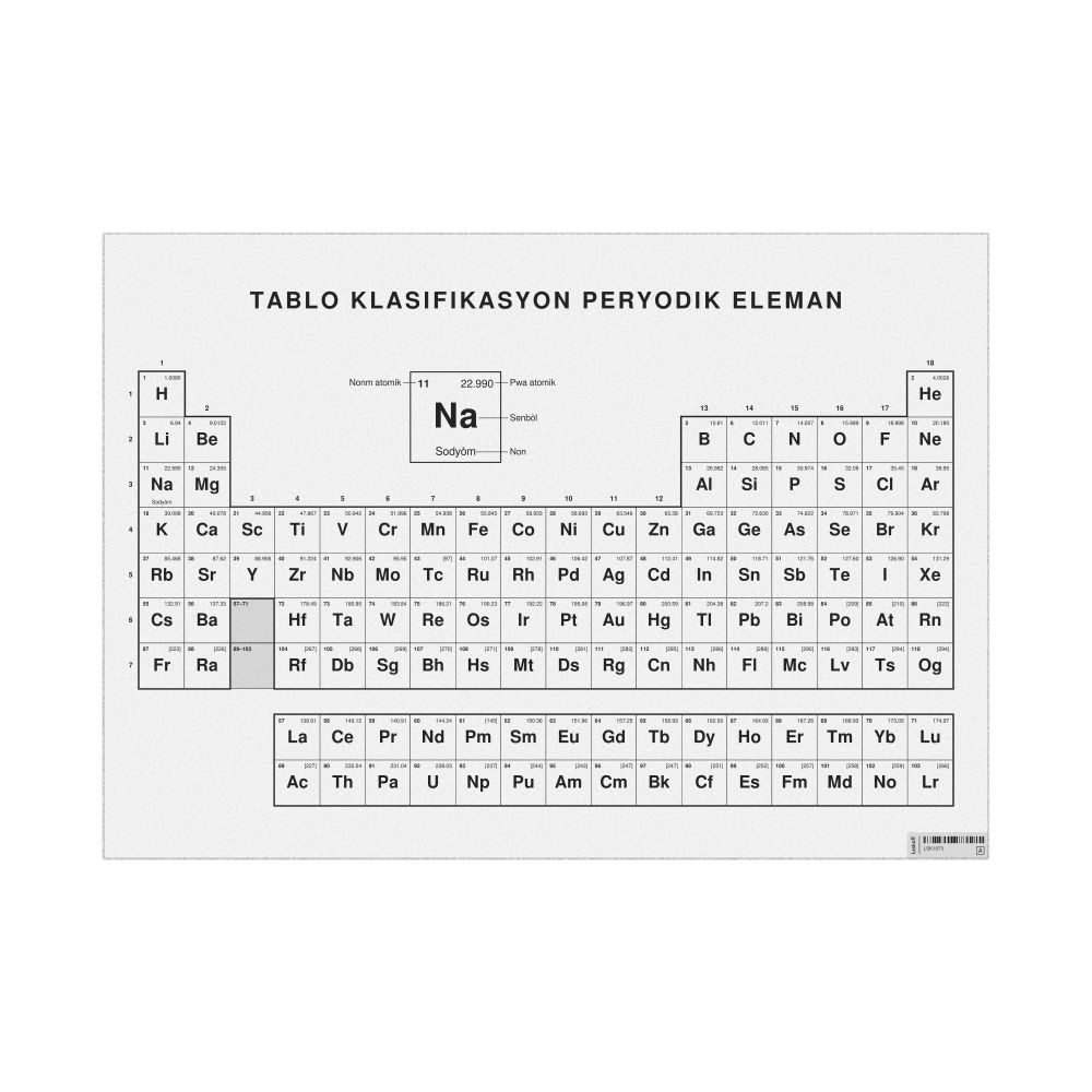 A periodic table chart in Haitian Creole (Tablo klasifikasyon peryodik eleman) in the 33.1 x 23.4 in (84.1 x 59.4 cm, poster / wall chart) format. 18-column layout featuring the atomic numbers, atomic weights, symbols, and names of all chemical elements.