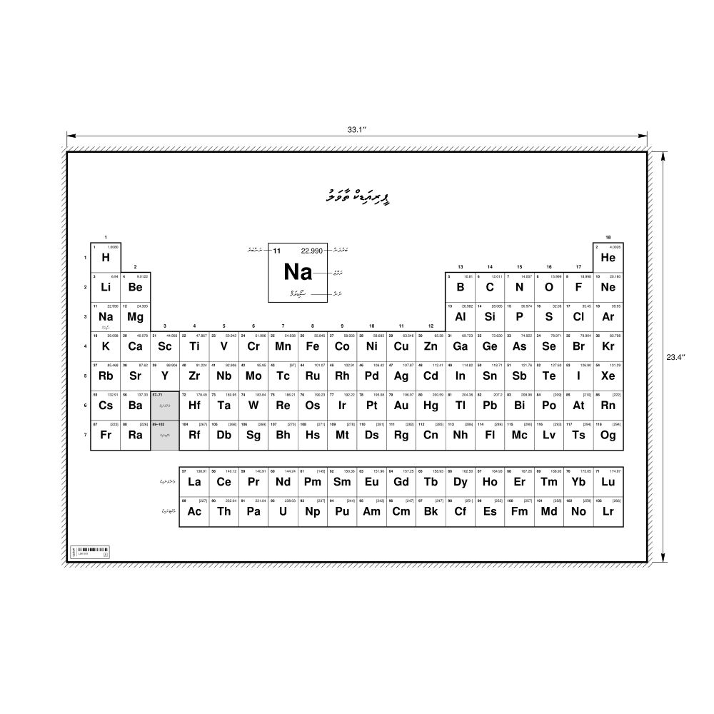 A periodic table chart in Maldivian (ޕީރިއަޑިކް ތާވަލު) in the 33.1 x 23.4 in (84.1 x 59.4 cm, poster / wall chart) format. 18-column layout featuring the atomic numbers, atomic weights, symbols, and names of all chemical elements.