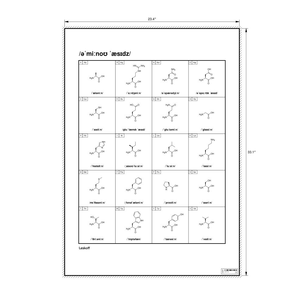 A poster featuring the 20 standard amino acids in IPA (International Phonetic Alphabet) for English. The poster shows the name, one-letter and three-letter codes, and molecular structure of each amino acid.