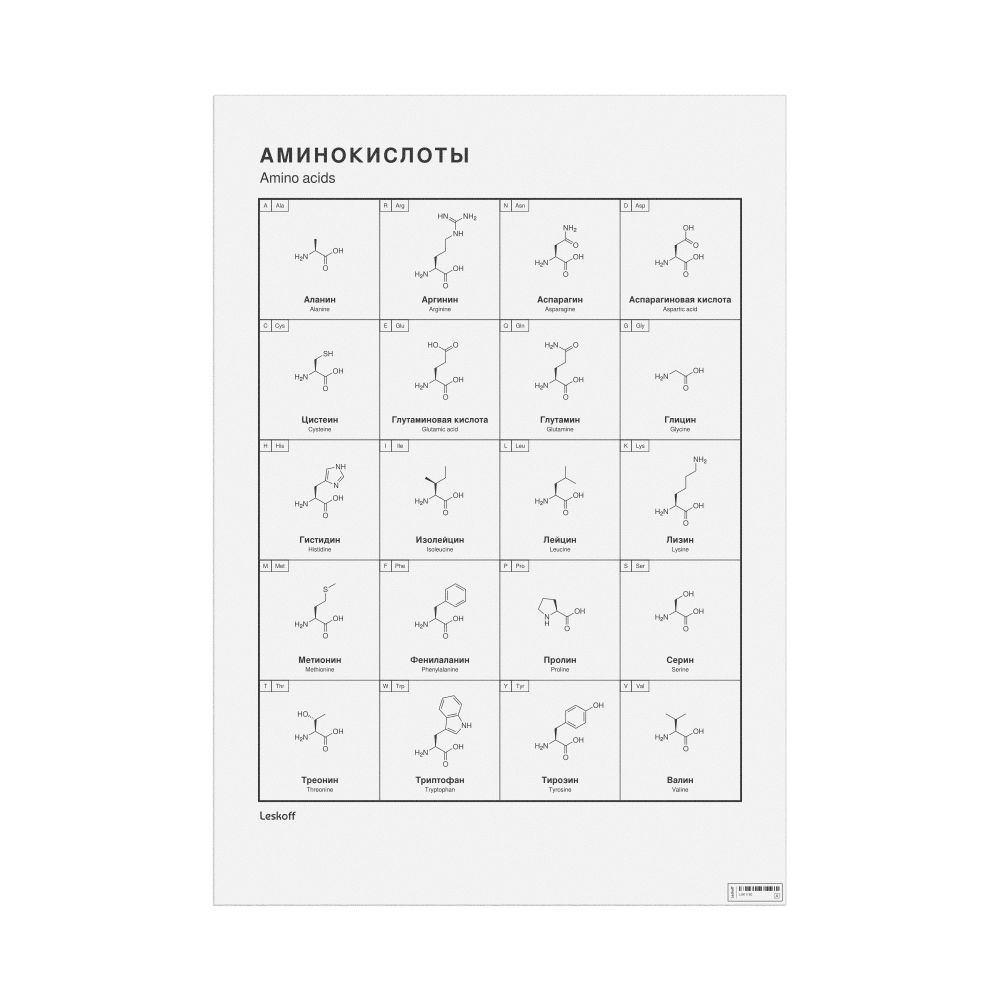 A poster featuring the 20 standard amino acids in Russian (Аминокислоты) with English translations. The poster shows the name, one-letter and three-letter codes, and molecular structure of each amino acid.