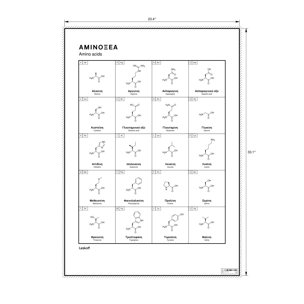 A poster featuring the 20 standard amino acids in Greek (Αμινοξέα) with English translations. The poster shows the name, one-letter and three-letter codes, and molecular structure of each amino acid.