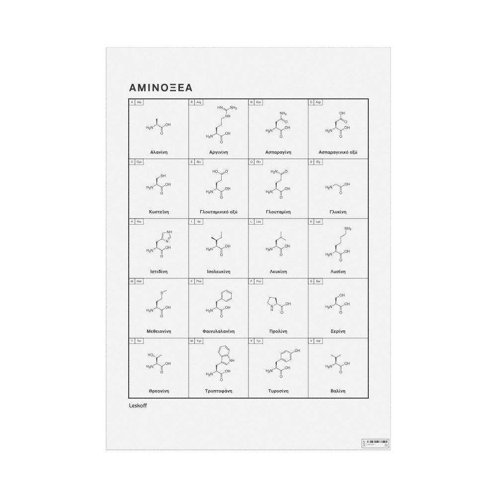 A poster featuring the 20 standard amino acids in Greek (Αμινοξέα). The poster shows the name, one-letter and three-letter codes, and molecular structure of each amino acid.
