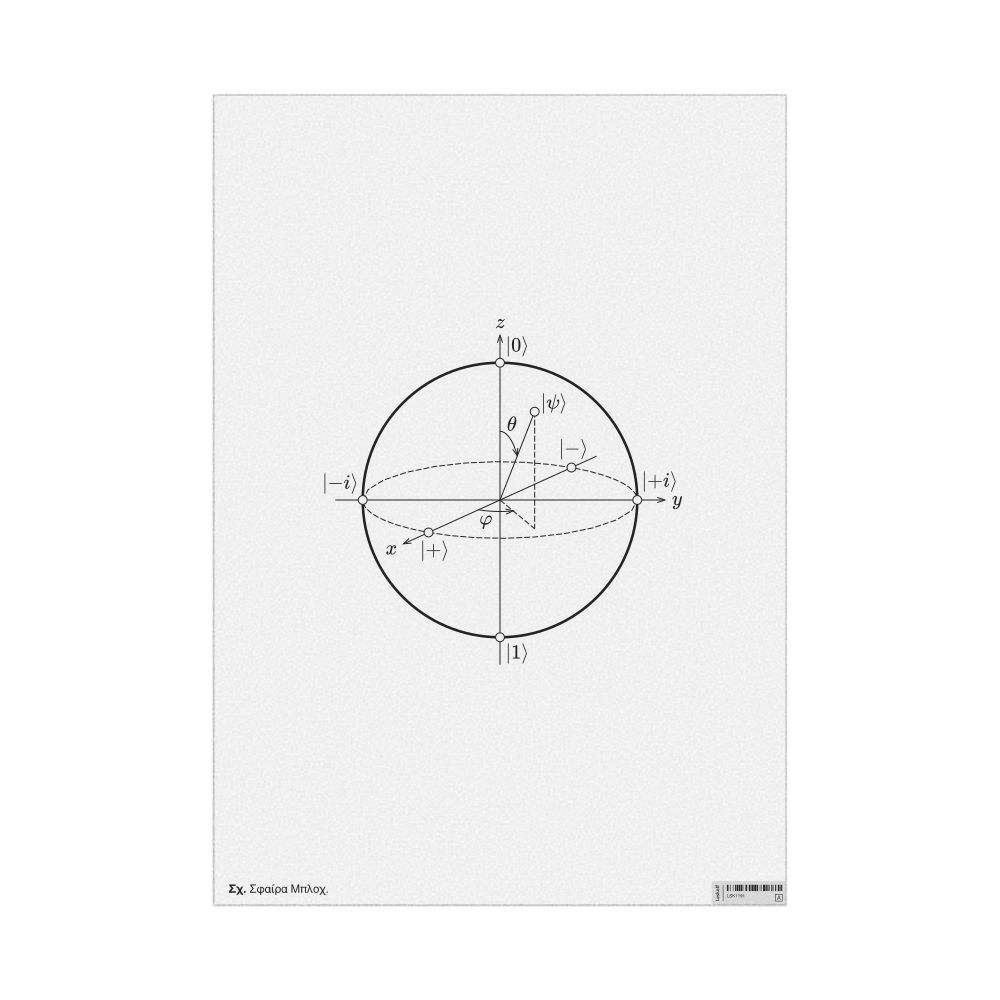 A poster featuring the Bloch sphere (a fundamental concept in quantum mechanics and quantum computing) in Greek (Σφαίρα Μπλοχ).