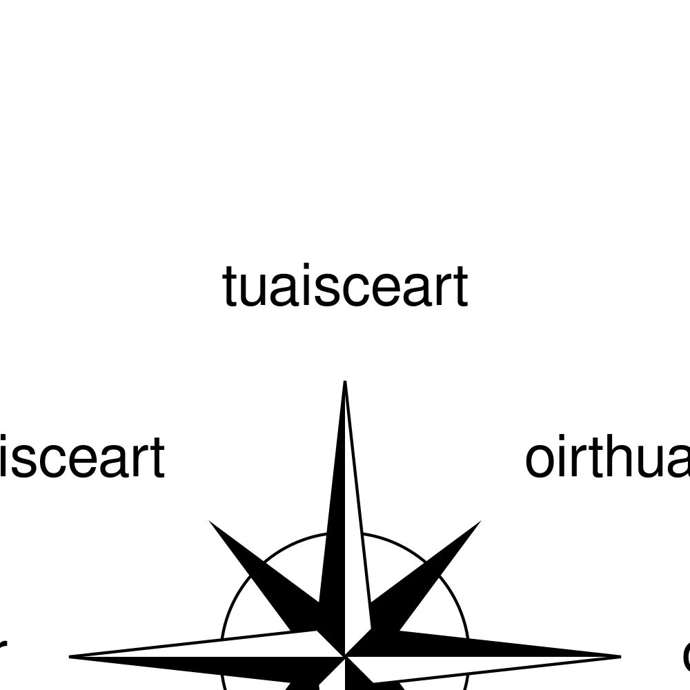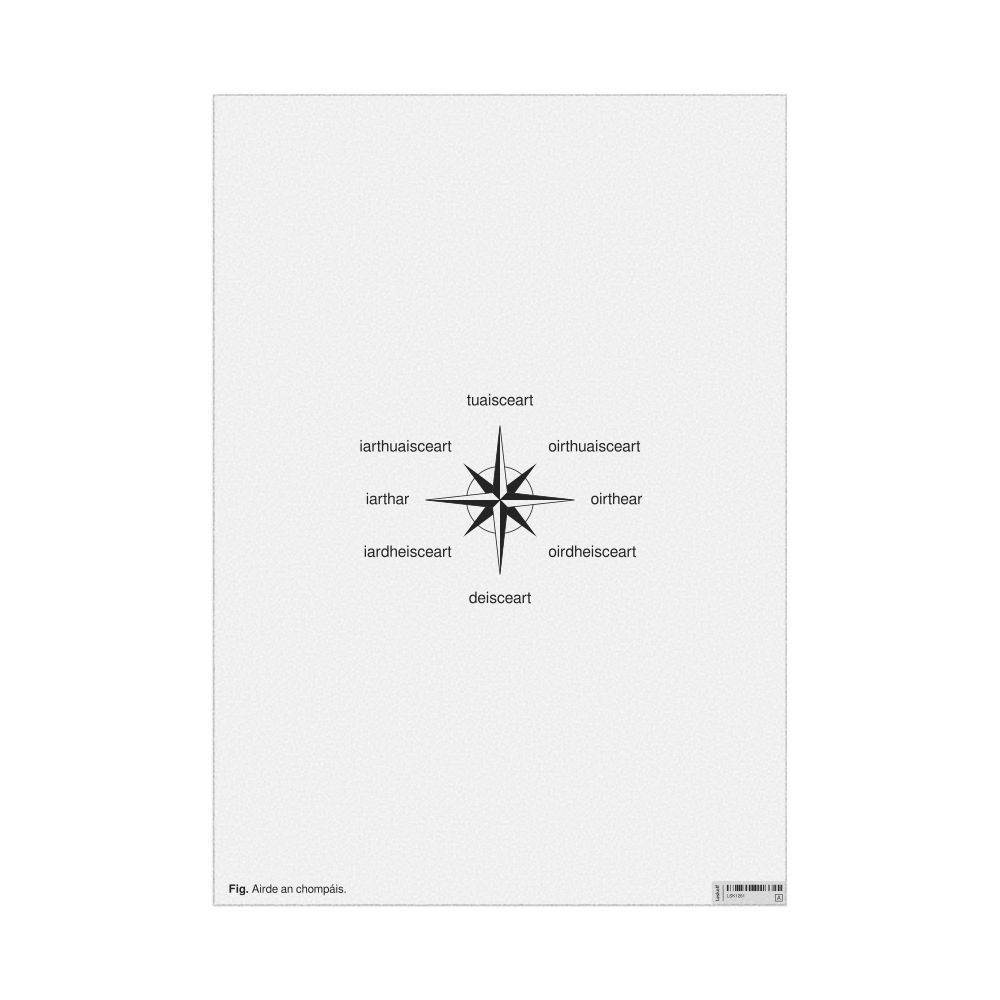 A poster of the cardinal directions (also known as compass points) in Irish (Airde an chompáis).