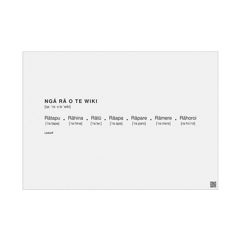 A poster of the days of the week in Māori (Ngā rā o te wiki) with IPA phonetic transcriptions (pronunciation guides).