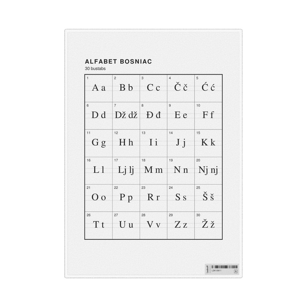 The Bosnian alphabet chart (the full set of letters) labeled in Romansh (Alfabet bosniac) in the 8.3 x 11.7 in (21.0 x 29.7 cm, desk chart, laminated) format.
