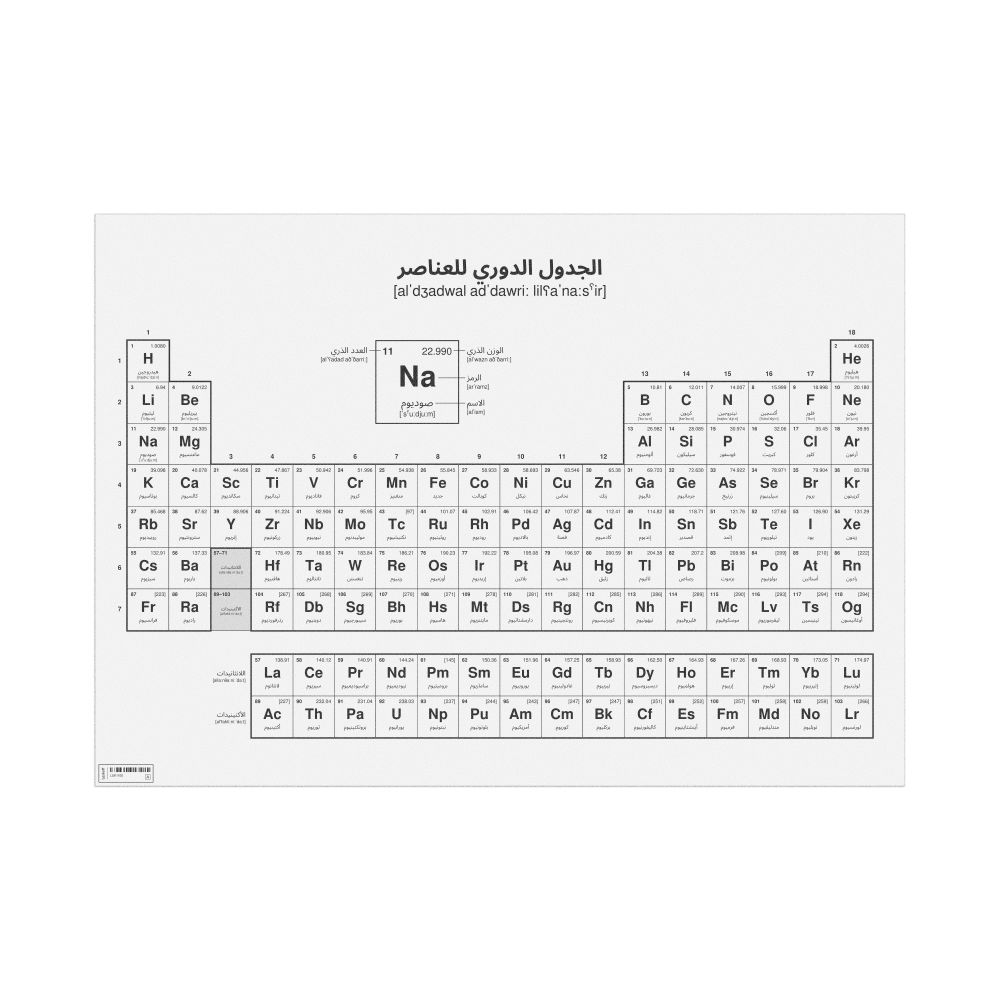A periodic table chart in Arabic (الجدول الدوري للعناصر) with IPA phonetic transcriptions (pronunciation guides) in the 33.1 x 23.4 in (84.1 x 59.4 cm, poster / wall chart) format. 18-column layout featuring the atomic numbers, atomic weights, symbols, and names of all chemical elements.