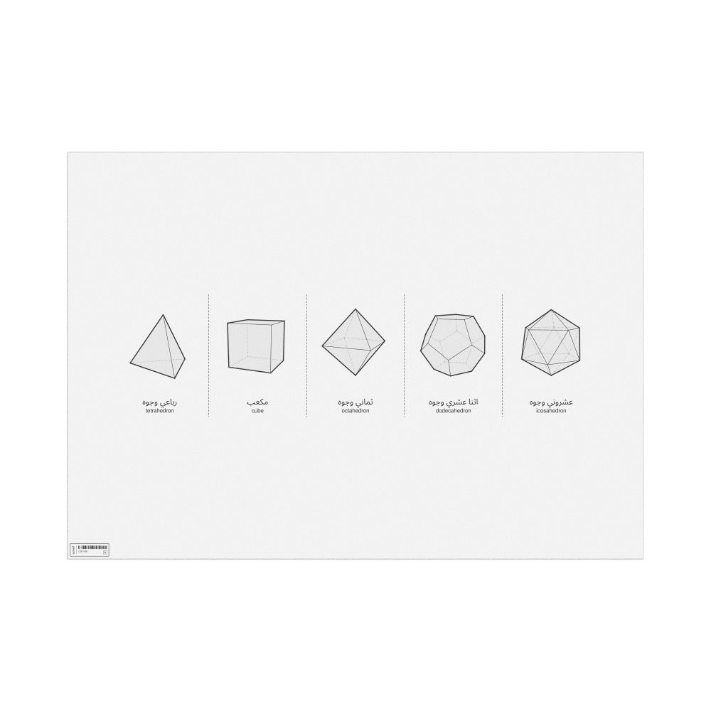 A poster of the Platonic solids in Arabic (مجسمات أفلاطونية) with English translations.