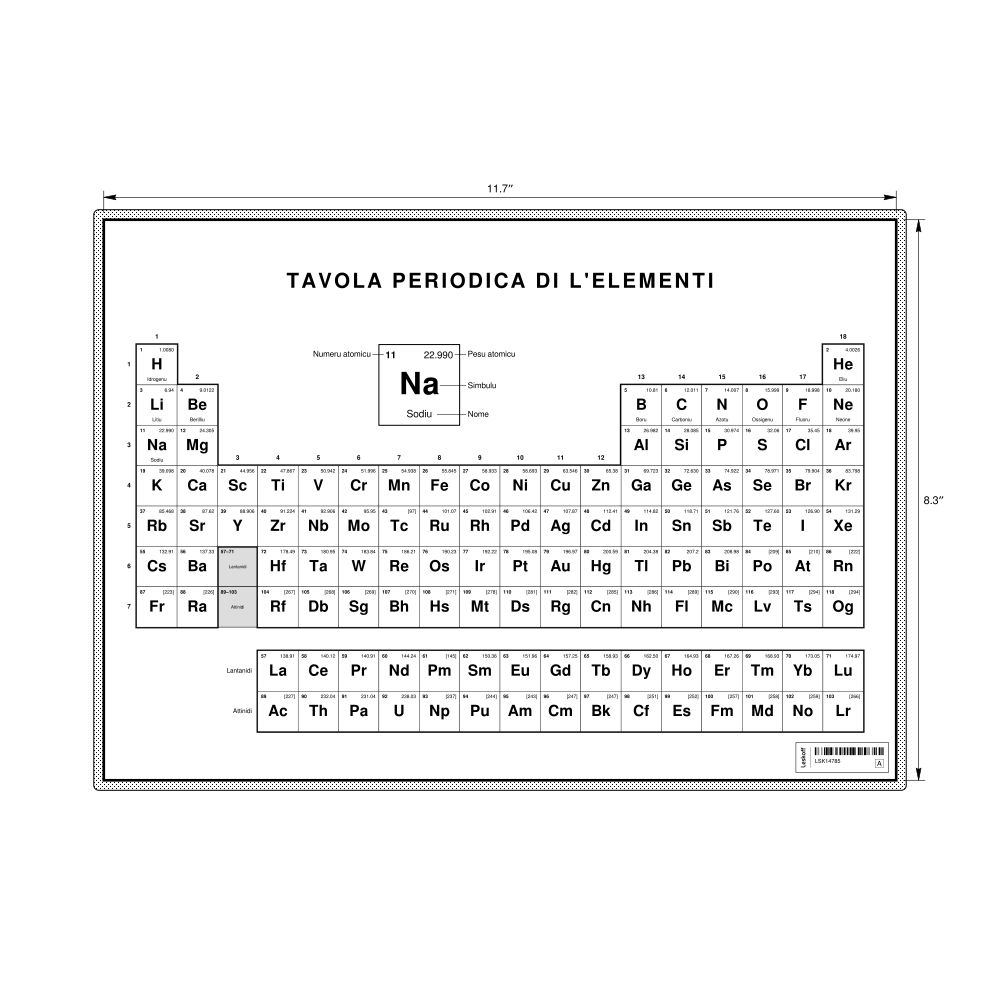 A periodic table chart in Corsican (Tavola periodica di l'elementi) in the 11.7 x 8.3 in (29.7 x 21.0 cm, desk chart, laminated) format. 18-column layout featuring the atomic numbers, atomic weights, symbols, and names of all chemical elements.