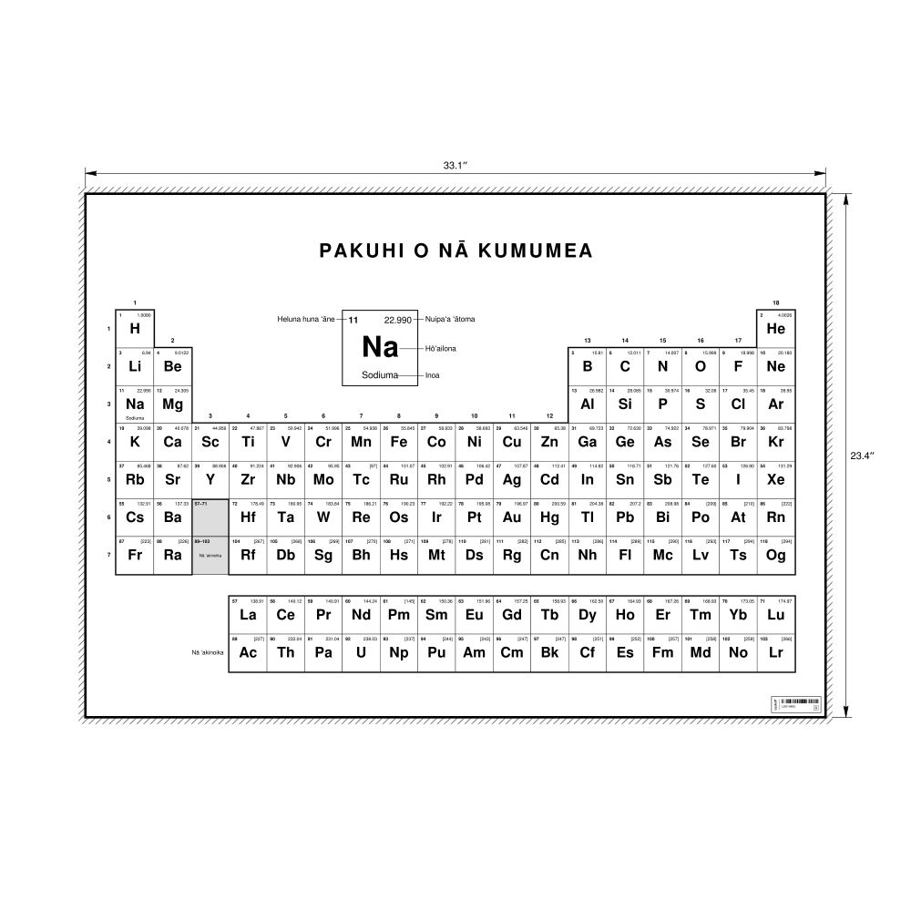 A periodic table chart in Hawaiian (Pakuhi o nā kumumea) in the 33.1 x 23.4 in (84.1 x 59.4 cm, poster / wall chart) format. 18-column layout featuring the atomic numbers, atomic weights, symbols, and names of all chemical elements.