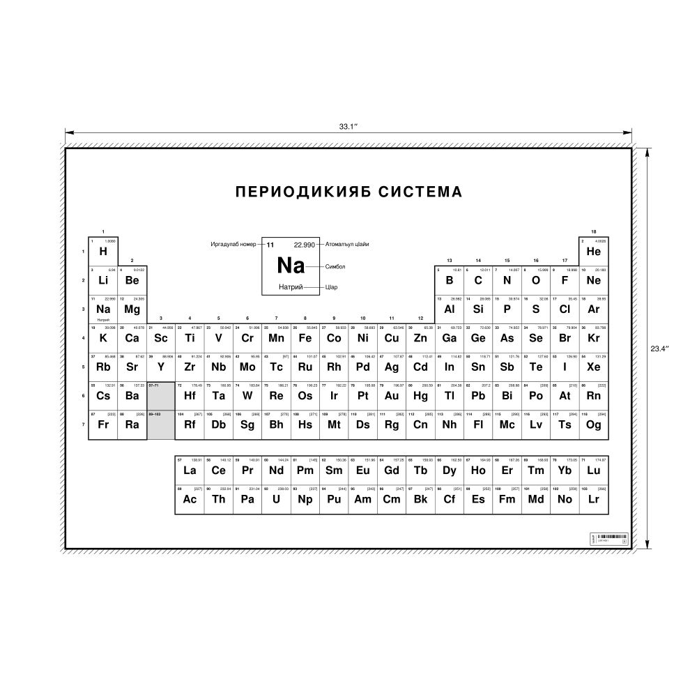 A periodic table chart in Avar (Периодикияб система) in the 33.1 x 23.4 in (84.1 x 59.4 cm, poster / wall chart) format. 18-column layout featuring the atomic numbers, atomic weights, symbols, and names of all chemical elements.
