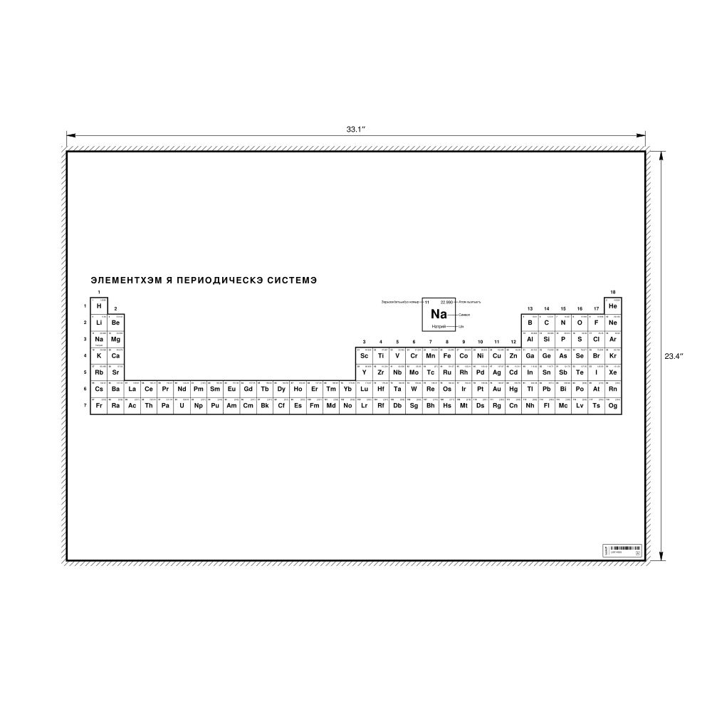 A periodic table chart in Kabardian (Элементхэм я периодическэ системэ) in the 33.1 x 23.4 in (84.1 x 59.4 cm, poster / wall chart) format. 32-column layout featuring the atomic numbers, atomic weights, symbols, and names of all chemical elements.