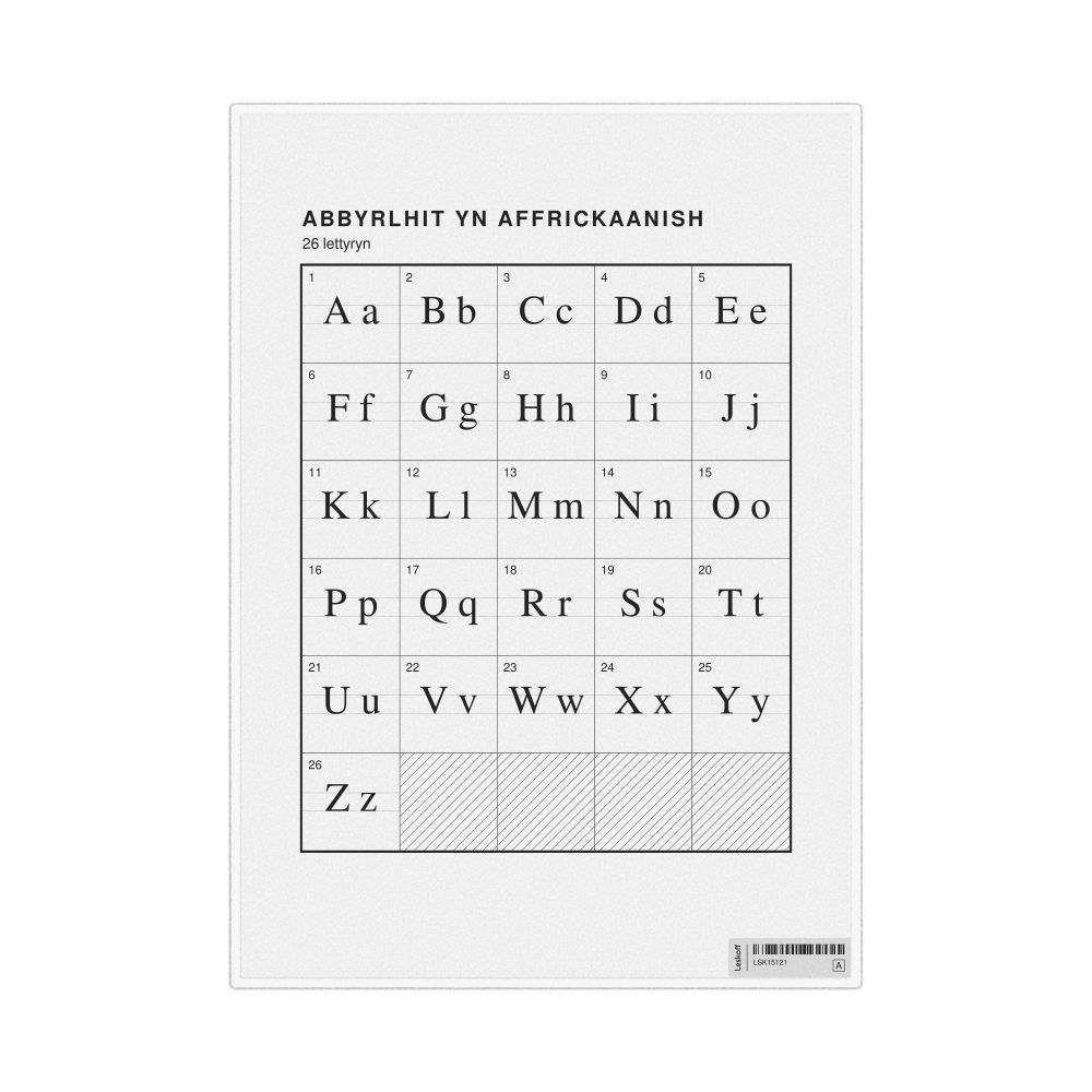 The Afrikaans alphabet chart (the full set of letters) labeled in Manx (Abbyrlhit yn Affrickaanish) in the 8.3 x 11.7 in (21.0 x 29.7 cm, desk chart, laminated) format.