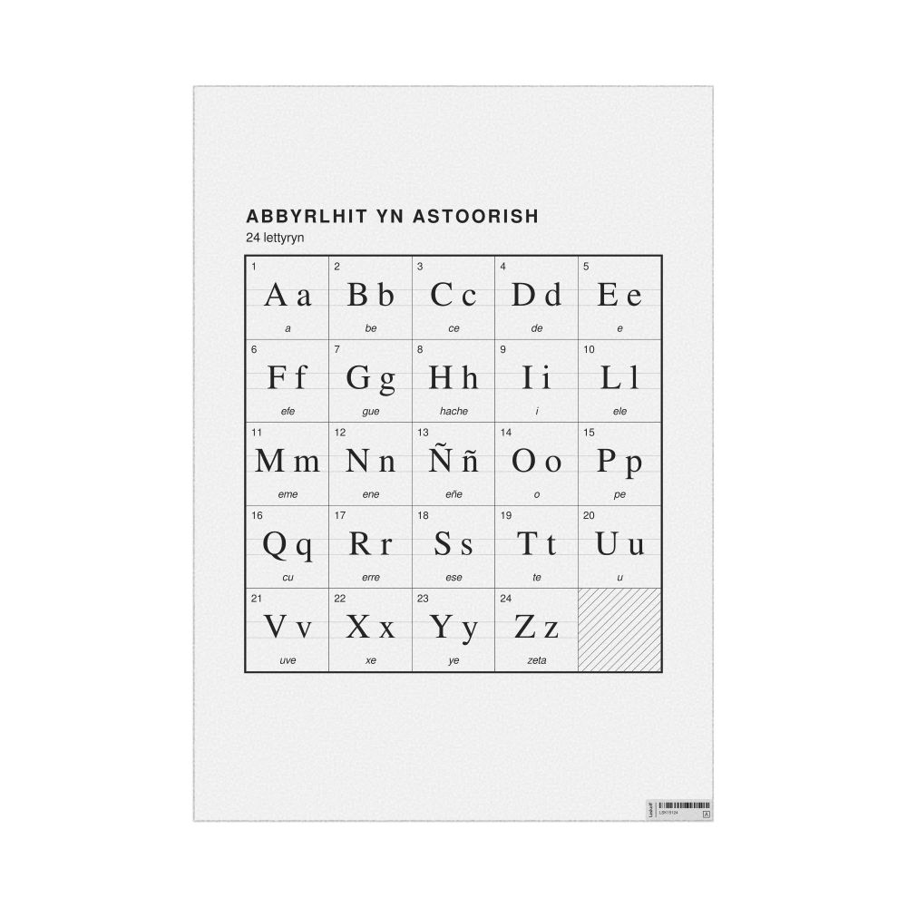 The Asturian alphabet chart (the full set of letters) labeled in Manx (Abbyrlhit yn Astoorish) in the 23.4 x 33.1 in (59.4 x 84.1 cm, poster / wall chart) format.