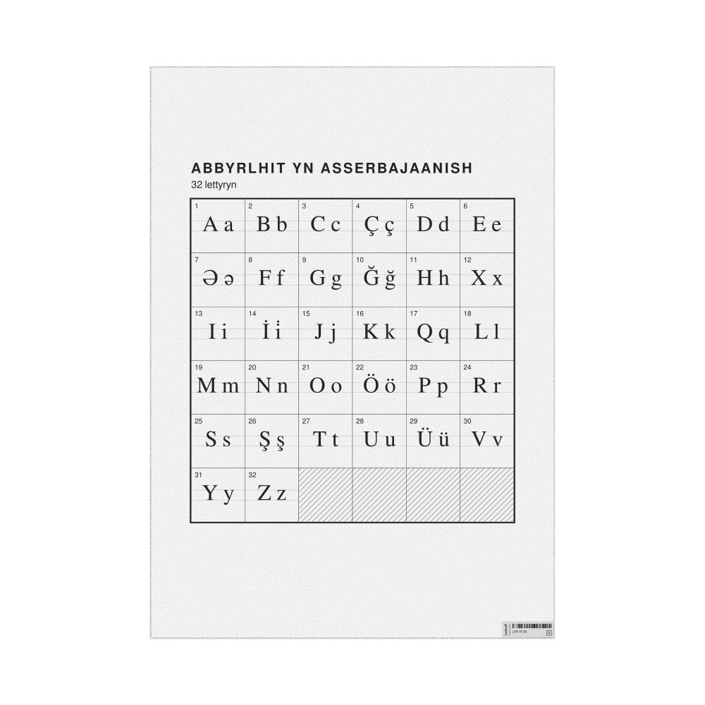 The Azerbaijani alphabet chart (the full set of letters) labeled in Manx (Abbyrlhit yn Asserbajaanish) in the 23.4 x 33.1 in (59.4 x 84.1 cm, poster / wall chart) format.
