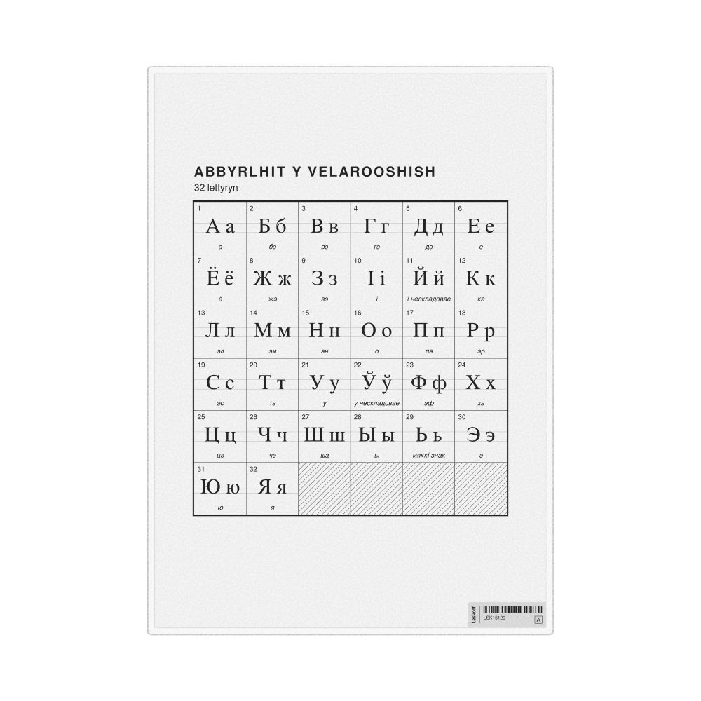 The Belarusian alphabet chart (the full set of letters) labeled in Manx (Abbyrlhit y Velarooshish) in the 8.3 x 11.7 in (21.0 x 29.7 cm, desk chart, laminated) format.