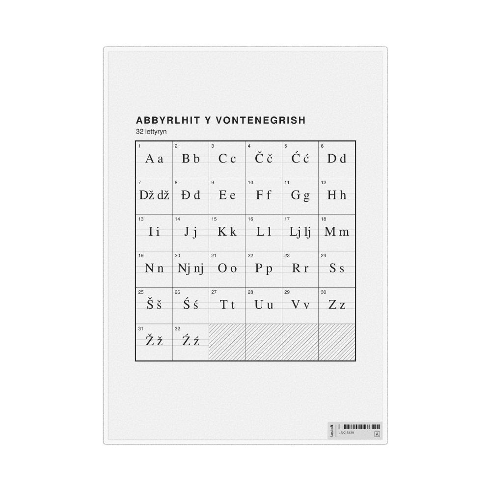 The Montenegrin alphabet chart (the full set of letters) labeled in Manx (Abbyrlhit y Vontenegrish) in the 8.3 x 11.7 in (21.0 x 29.7 cm, desk chart, laminated) format.
