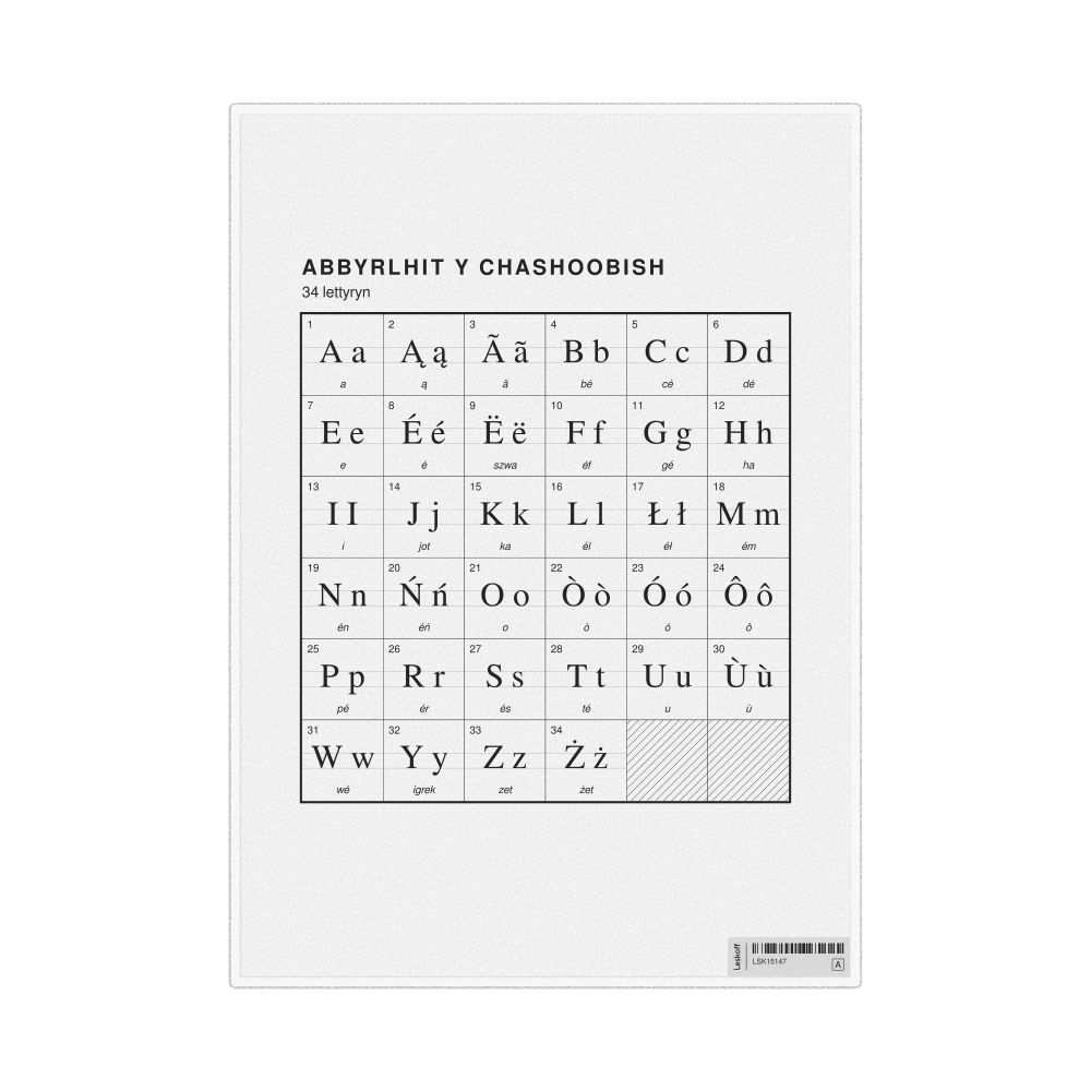 The Kashubian alphabet chart (the full set of letters) labeled in Manx (Abbyrlhit y Chashoobish) in the 8.3 x 11.7 in (21.0 x 29.7 cm, desk chart, laminated) format.