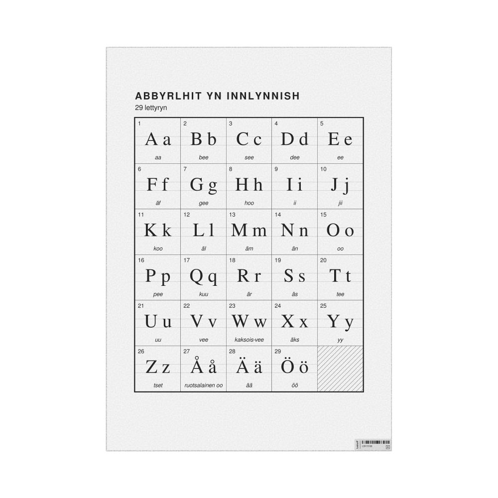 The Finnish alphabet chart (the full set of letters) labeled in Manx (Abbyrlhit yn Innlynnish) in the 23.4 x 33.1 in (59.4 x 84.1 cm, poster / wall chart) format.