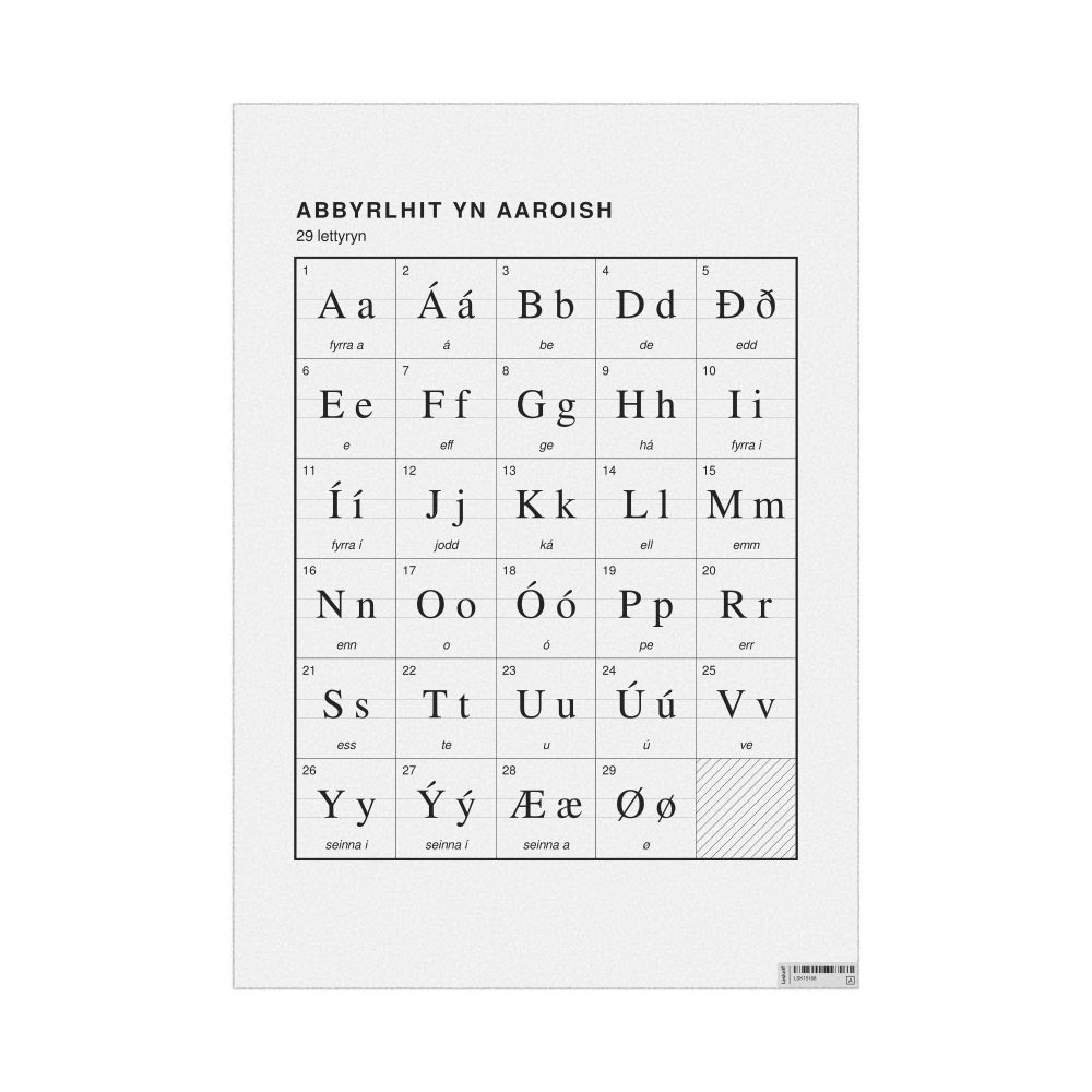 The Faroese alphabet chart (the full set of letters) labeled in Manx (Abbyrlhit yn Aaroish) in the 23.4 x 33.1 in (59.4 x 84.1 cm, poster / wall chart) format.