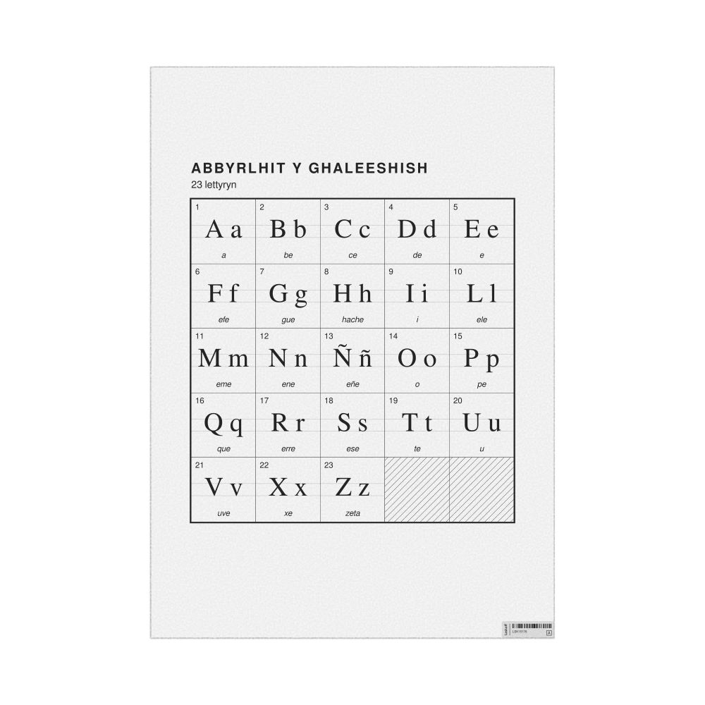 The Galician alphabet chart (the full set of letters) labeled in Manx (Abbyrlhit y Ghaleeshish) in the 23.4 x 33.1 in (59.4 x 84.1 cm, poster / wall chart) format.