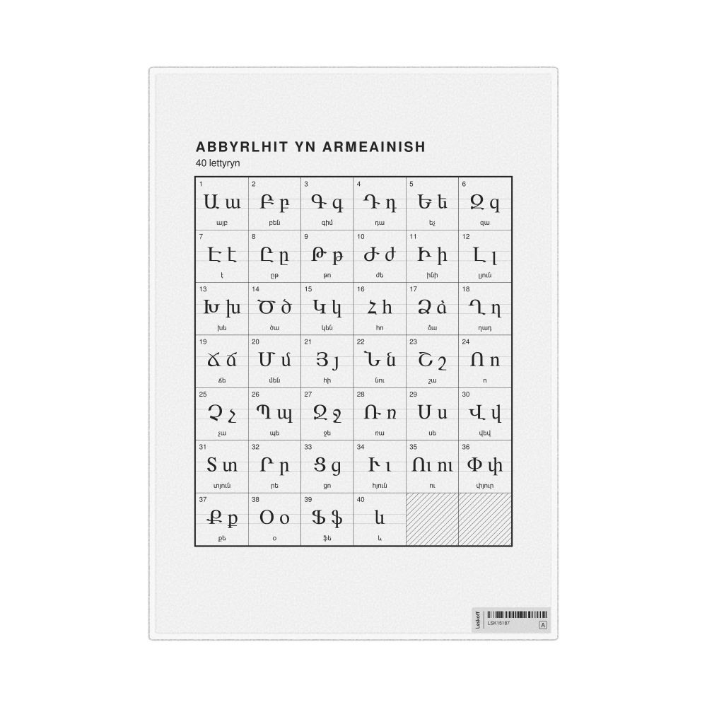 The Armenian alphabet chart (the full set of letters) labeled in Manx (Abbyrlhit yn Armeainish) in the 8.3 x 11.7 in (21.0 x 29.7 cm, desk chart, laminated) format.