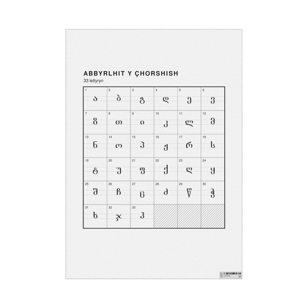 The Georgian alphabet chart (the full set of letters) labeled in Manx (Abbyrlhit y Çhorshish) in the 23.4 x 33.1 in (59.4 x 84.1 cm, poster / wall chart) format.