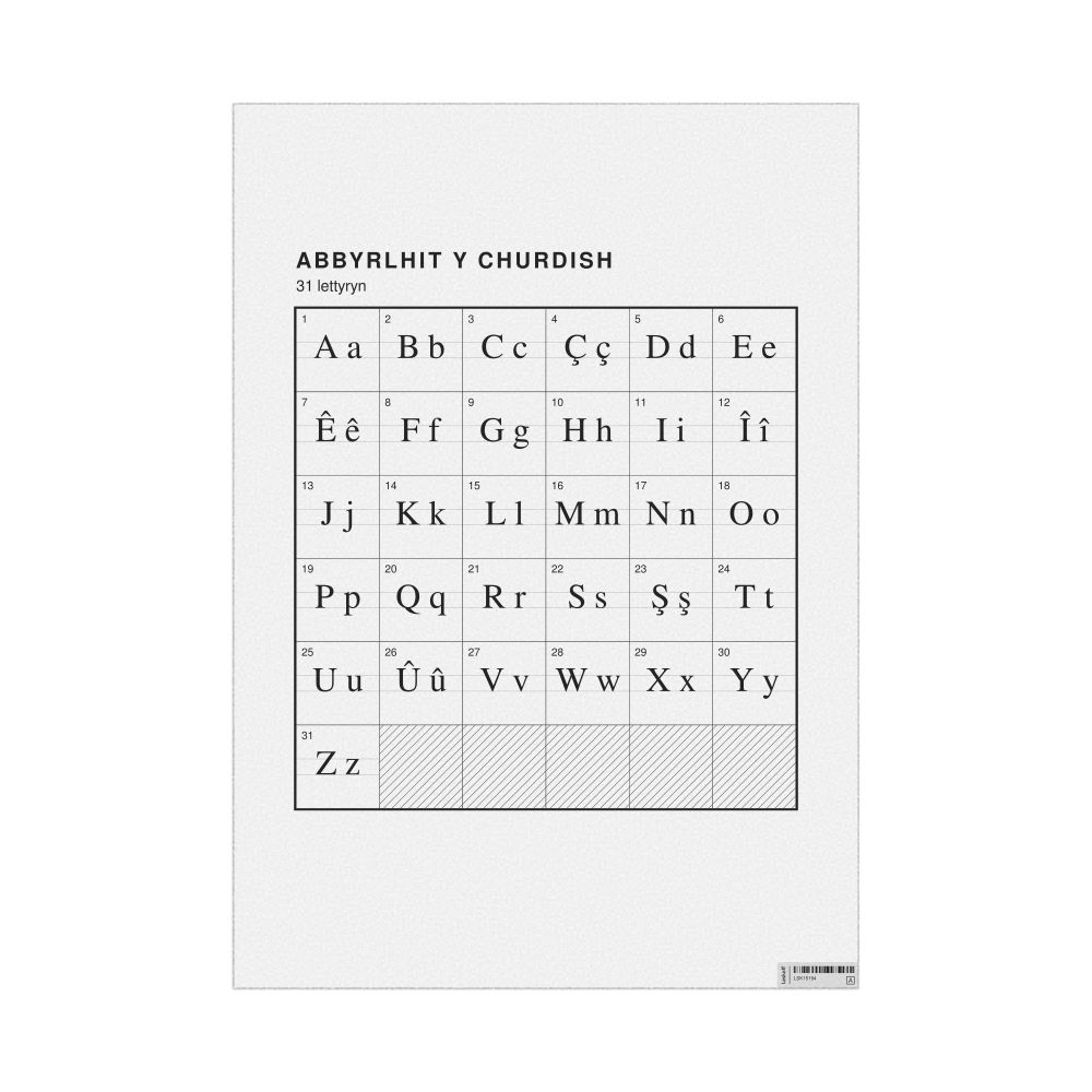 The Kurdish alphabet chart (the full set of letters) labeled in Manx (Abbyrlhit y Churdish) in the 23.4 x 33.1 in (59.4 x 84.1 cm, poster / wall chart) format.
