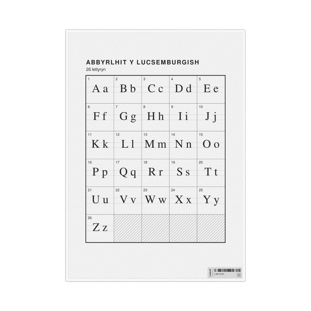 The Luxembourgish alphabet chart (the full set of letters) labeled in Manx (Abbyrlhit y Lucsemburgish) in the 8.3 x 11.7 in (21.0 x 29.7 cm, desk chart, laminated) format.