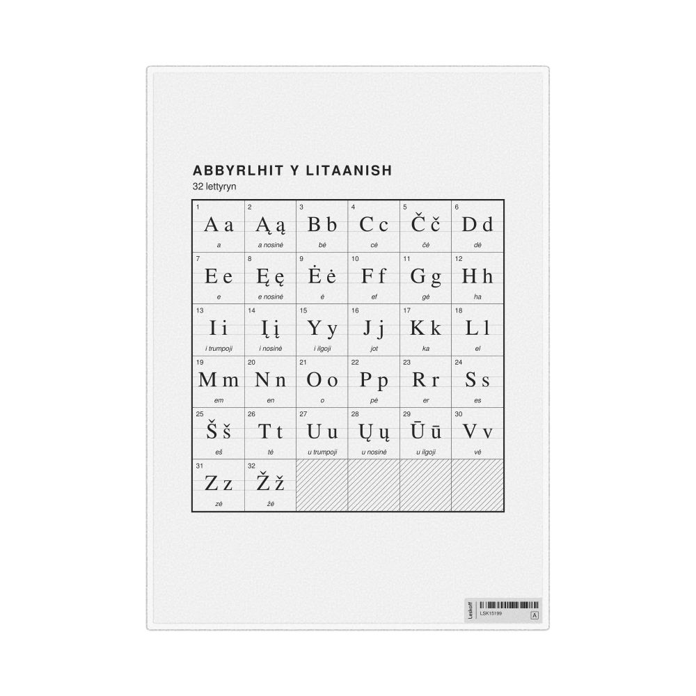 The Lithuanian alphabet chart (the full set of letters) labeled in Manx (Abbyrlhit y Litaanish) in the 8.3 x 11.7 in (21.0 x 29.7 cm, desk chart, laminated) format.