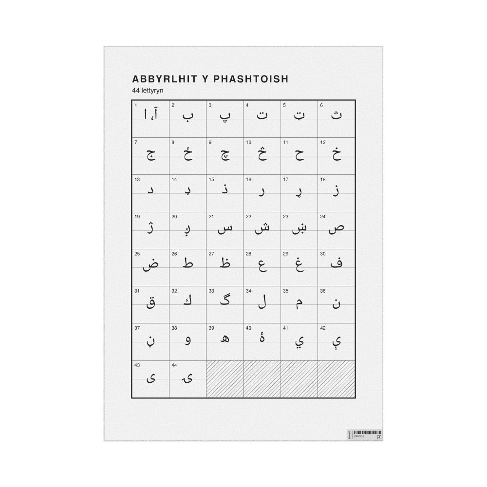 The Pashto alphabet chart (the full set of letters) labeled in Manx (Abbyrlhit y Phashtoish) in the 23.4 x 33.1 in (59.4 x 84.1 cm, poster / wall chart) format.