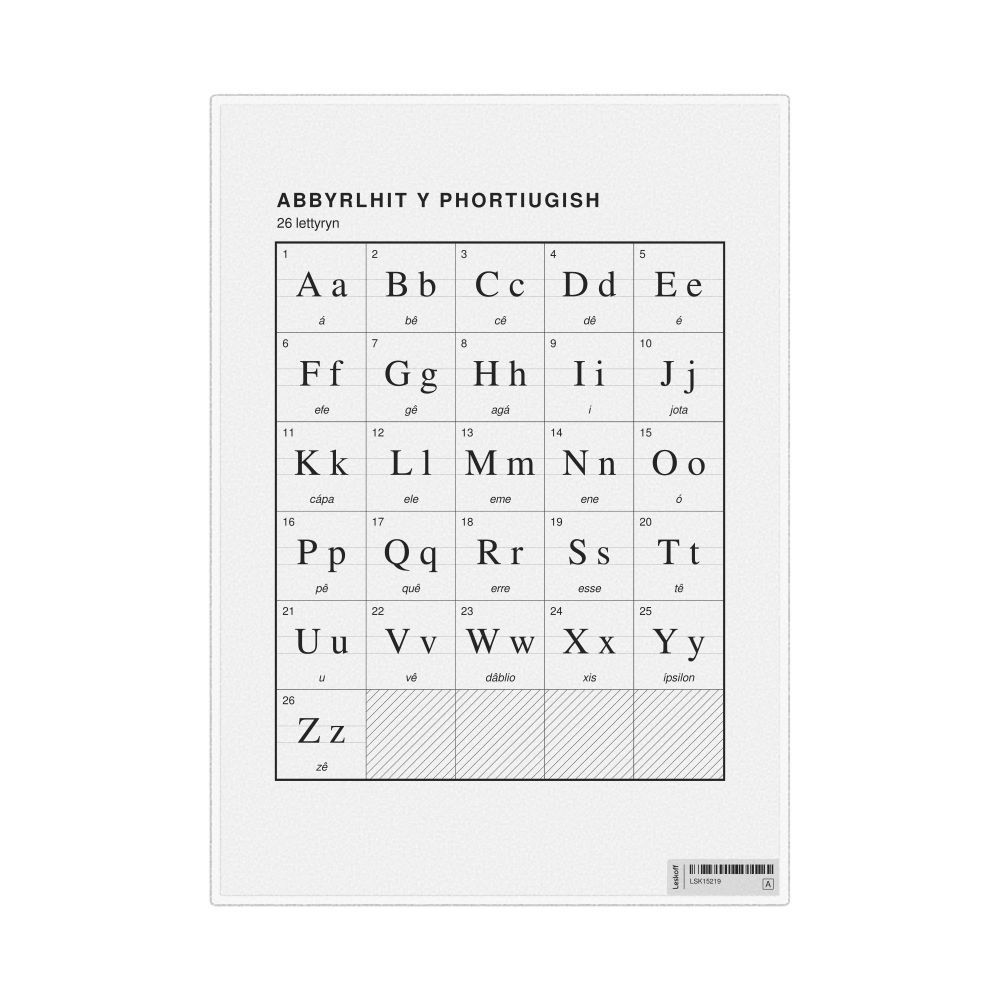 The Portuguese alphabet chart (the full set of letters) labeled in Manx (Abbyrlhit y Phortiugish) in the 8.3 x 11.7 in (21.0 x 29.7 cm, desk chart, laminated) format.