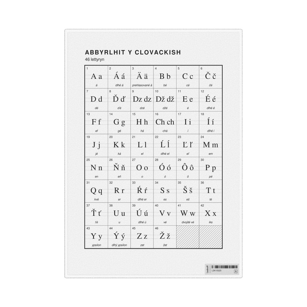 The Slovak alphabet chart (the full set of letters) labeled in Manx (Abbyrlhit y Clovackish) in the 8.3 x 11.7 in (21.0 x 29.7 cm, desk chart, laminated) format.