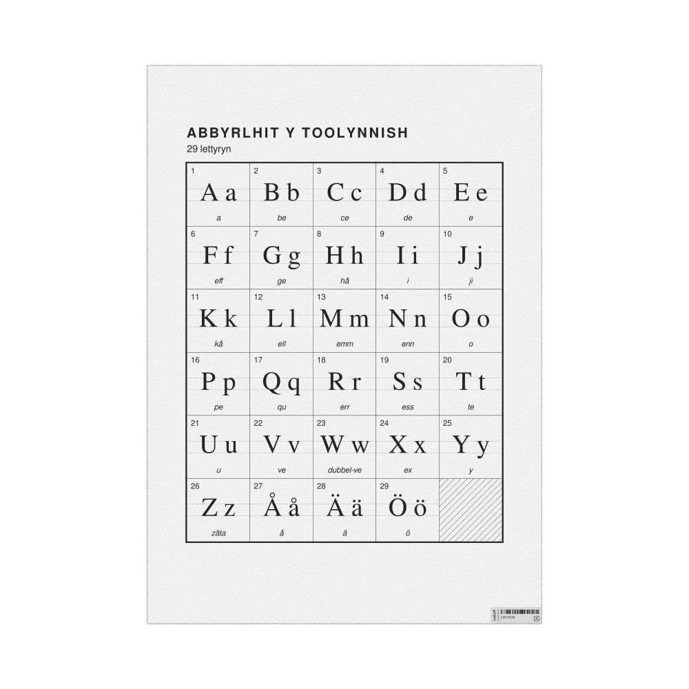 The Swedish alphabet chart (the full set of letters) labeled in Manx (Abbyrlhit y Toolynnish) in the 23.4 x 33.1 in (59.4 x 84.1 cm, poster / wall chart) format.