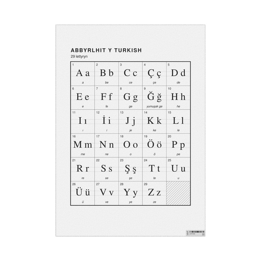 The Turkish alphabet chart (the full set of letters) labeled in Manx (Abbyrlhit y Turkish) in the 23.4 x 33.1 in (59.4 x 84.1 cm, poster / wall chart) format.