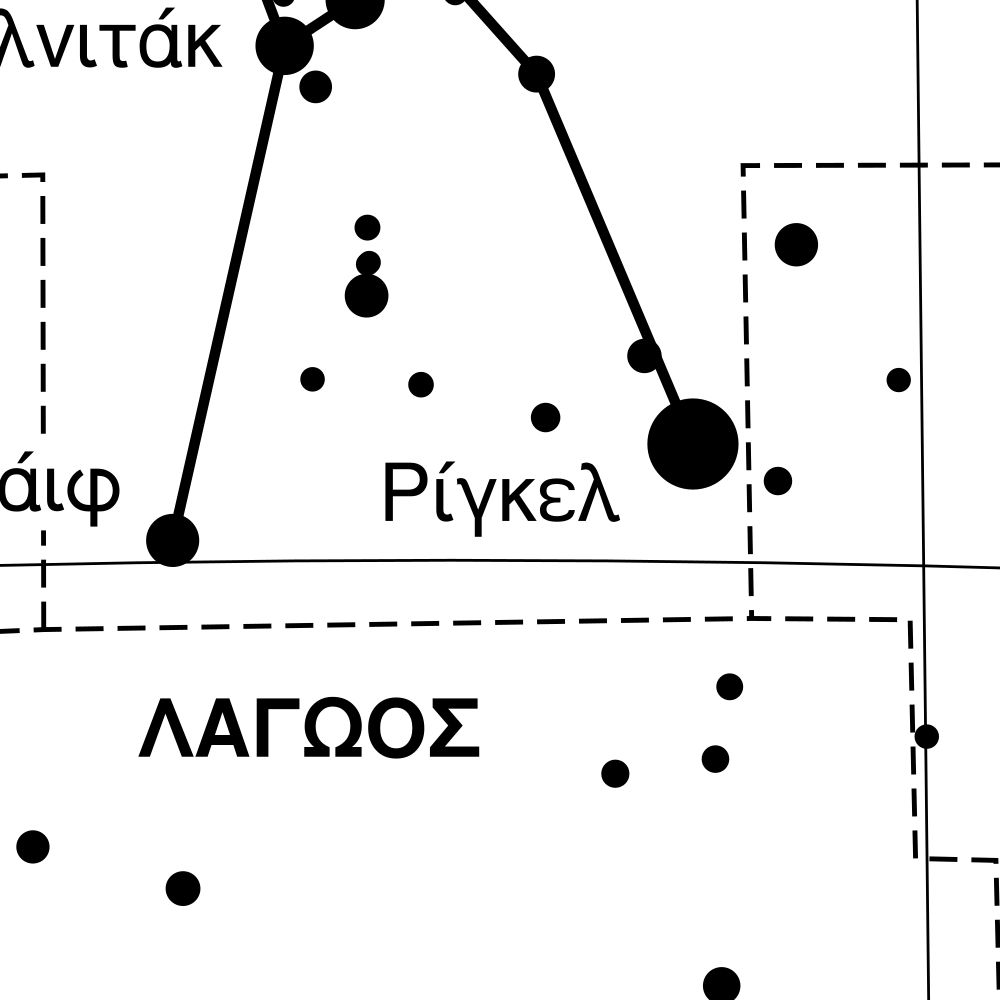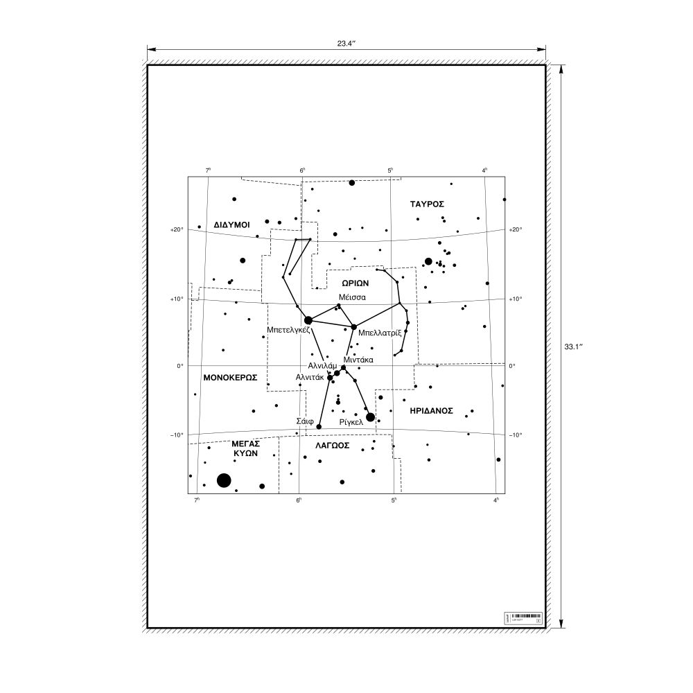 A poster featuring the Orion constellation chart in Greek (Ωρίων).