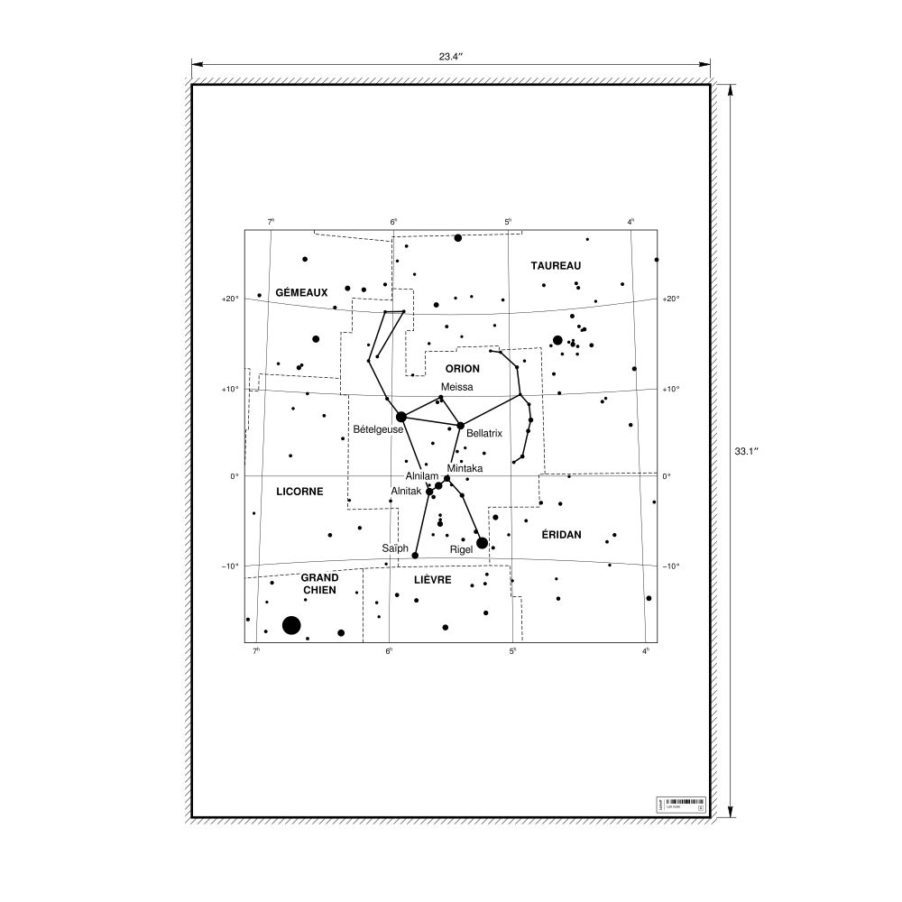 A poster featuring the Orion constellation chart in French (Orion).