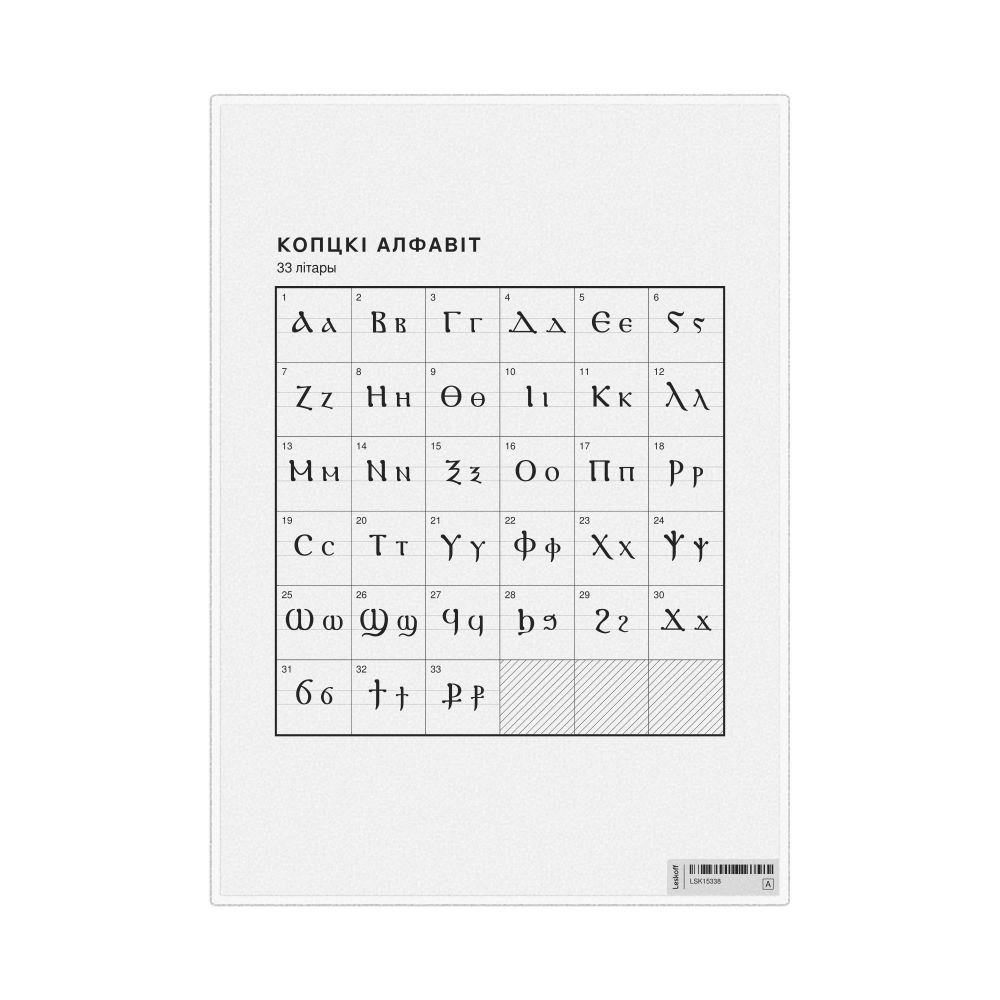 The Coptic alphabet chart (the full set of letters) labeled in Belarusian (Копцкі алфавіт) in the 8.3 x 11.7 in (21.0 x 29.7 cm, desk chart, laminated) format.