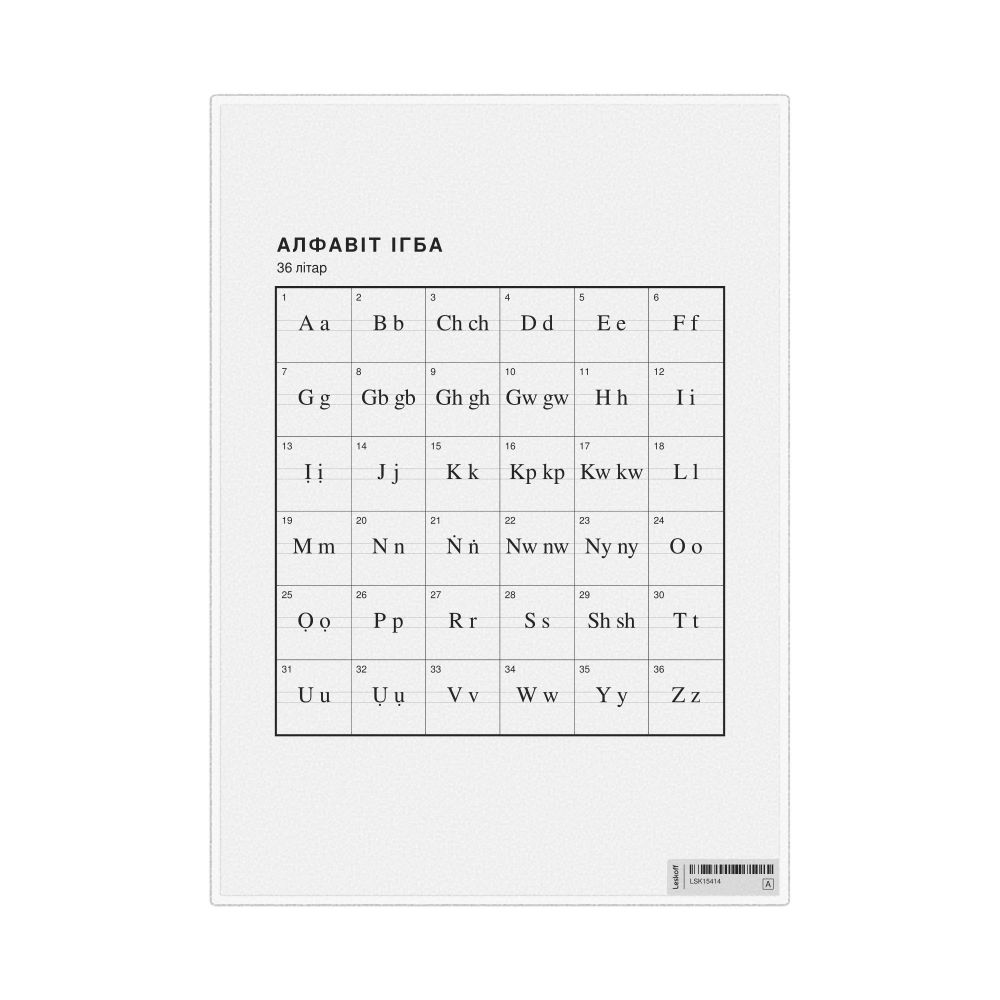 - Linguists and philologists - For both professionals and hobbyists, this alphabet print serves as a piece of linguistic art that presents the character inventory of Igbo as a linguistic (graphemic) dataset. Add this to your Igbo collection to complement your studies and research. A mixture of Igbo letters and Belarusian metatext makes it a unique, visually intriguing illustration of linguistic diversity and interaction.