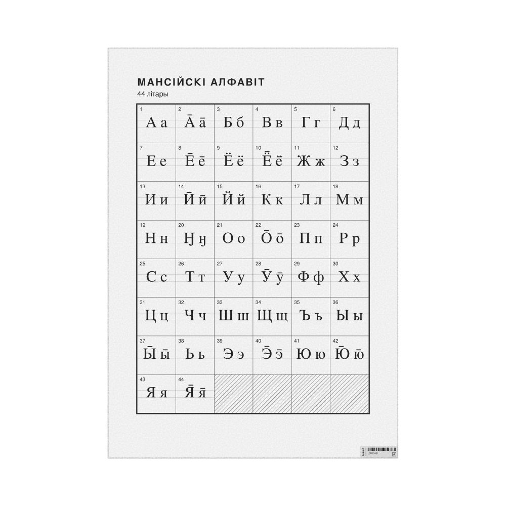 The Mansi alphabet chart (the full set of letters) labeled in Belarusian (Мансійскі алфавіт) in the 23.4 x 33.1 in (59.4 x 84.1 cm, poster / wall chart) format.