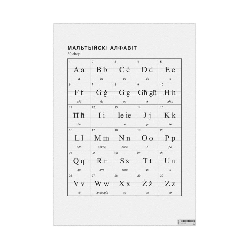 The Maltese alphabet chart (the full set of letters) labeled in Belarusian (Мальтыйскі алфавіт) in the 23.4 x 33.1 in (59.4 x 84.1 cm, poster / wall chart) format.