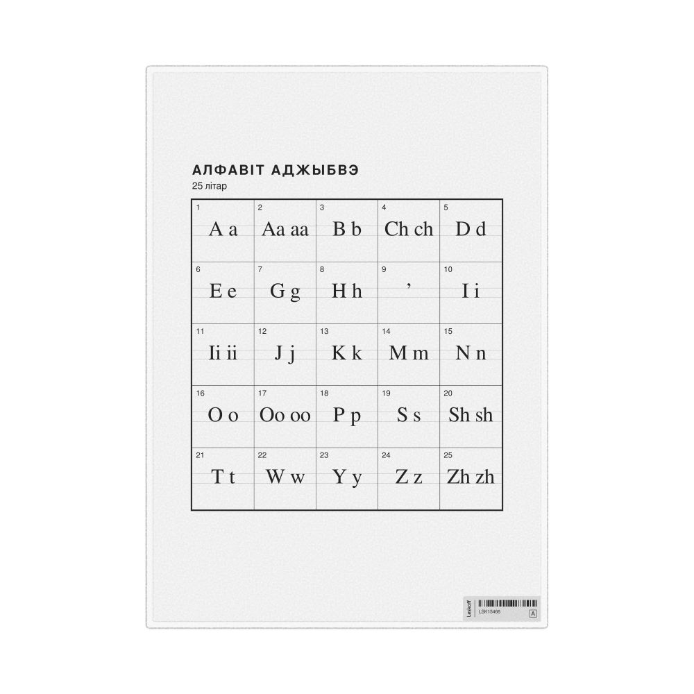 The Ojibwe alphabet chart (the full set of letters) labeled in Belarusian (Алфавіт аджыбвэ) in the 8.3 x 11.7 in (21.0 x 29.7 cm, desk chart, laminated) format.