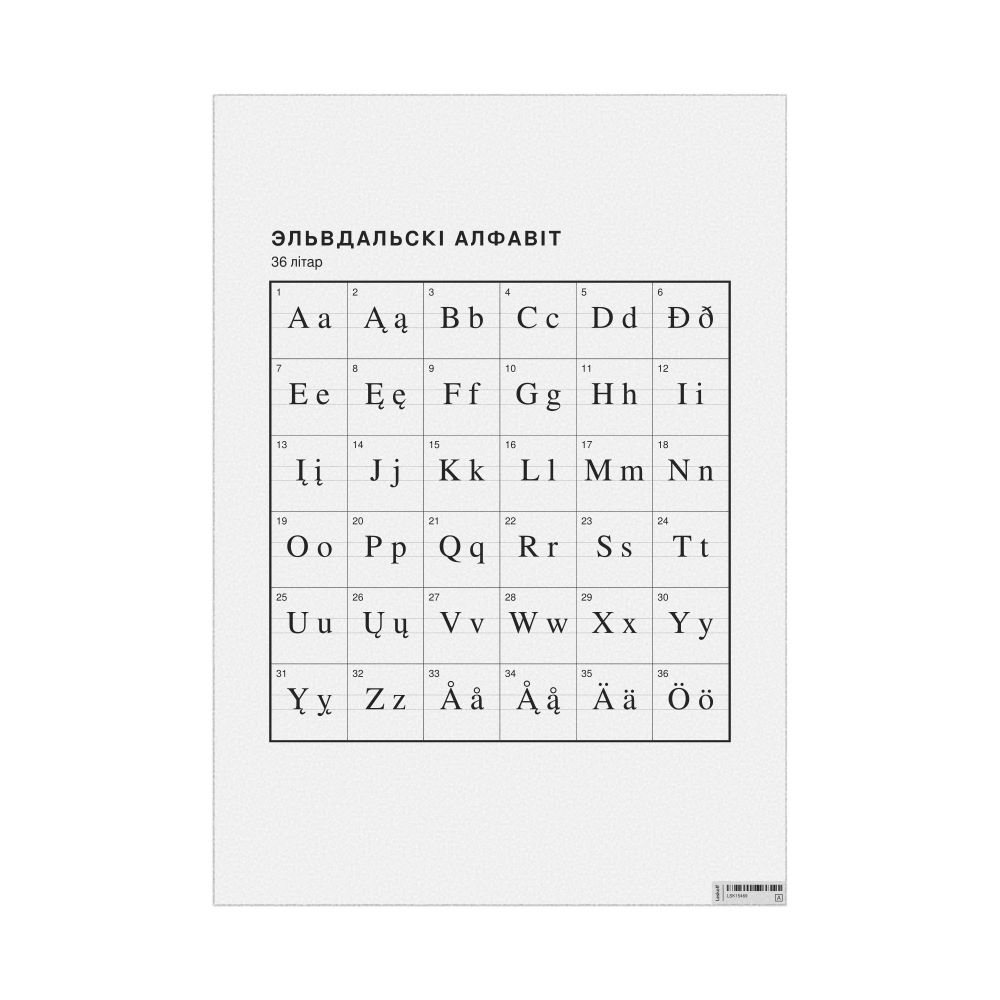 The Elfdalian alphabet chart (the full set of letters) labeled in Belarusian (Эльвдальскі алфавіт) in the 23.4 x 33.1 in (59.4 x 84.1 cm, poster / wall chart) format.