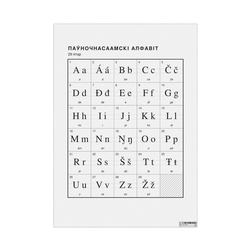 The Northern Sámi alphabet chart (the full set of letters) labeled in Belarusian (Паўночнасаамскі алфавіт) in the 23.4 x 33.1 in (59.4 x 84.1 cm, poster / wall chart) format.